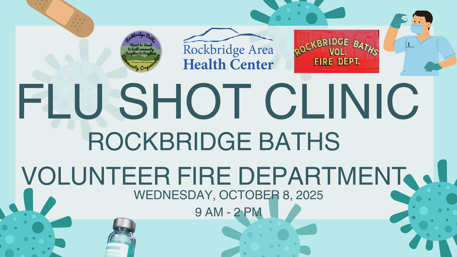 Rockbridge Baths Volunteer Fire Department 5024 Maury River Rd, Rockbridge BathsRockbridge Area Health Center, in partnership with the Rockbridge Baths Community Organization and the Rockbridge Baths Volunteer Fire Department, will host a flu shot clinic on Wednesday, October 8, 2025, from 9 am to 2 pm. Anyone interested must pre-register by October 1. Call or text 540-464-8700, ext. 7110 to register. We will not have […]